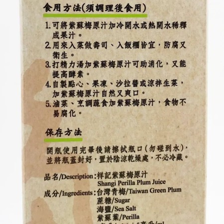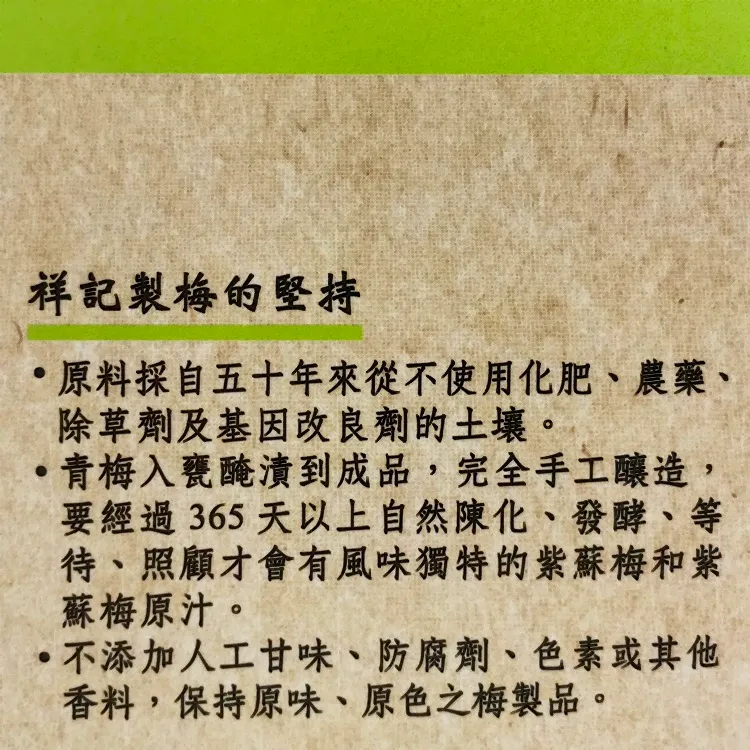 祥記製梅的堅持 原料採自五十年來從不使用化肥、農藥、除草劑及基因改良劑的土壤。 青梅入甕漬到成品,完全手工釀造,要經過365天以上自然陳化、發酵、等待、照顧才會有風味獨特的紫蘇梅和紫蘇梅原汁。