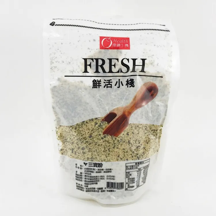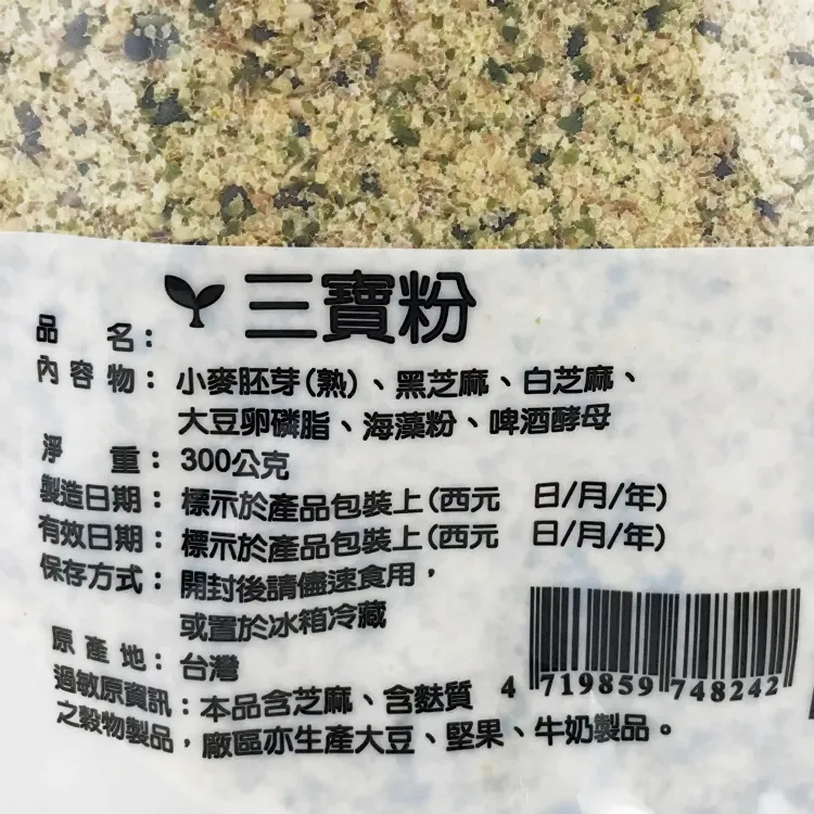 【品名】三寶粉 【成分】小麥胚芽(熟)、黑芝麻、白芝麻、大豆卵磷脂、海藻粉、啤酒酵母 【原產地】台灣 【內容量】300公克 【保存期限】一年 【保存方法】開封後請儘速食用,或置於冰箱冷藏 【過敏原資訊】本產品含芝麻、含麩質之穀物,產區亦生產大豆、堅果、牛奶製品。