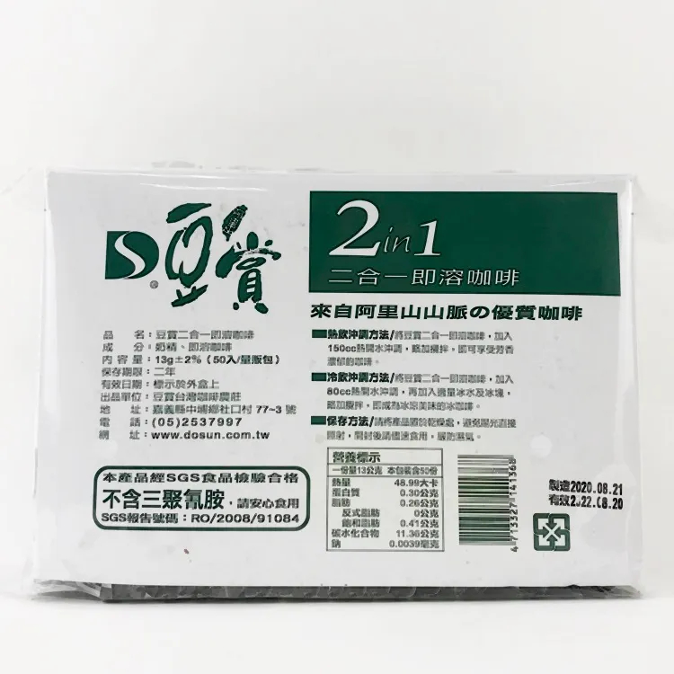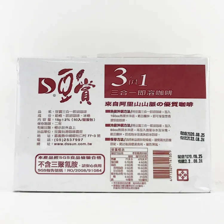 【品名】豆賞二合一即溶咖啡 【成份】奶精、即溶咖啡 【產地】印度/台灣 【內容量】50包(每包13公克±2%) 【品名】加比山三合一即溶咖啡 【成份】奶精、即溶咖啡、冰糖 【產地】印度/台灣 【內容量】50包(每包15公克±2%) 【咖啡因】45毫克/包 【注意事項】建議每日攝取量應低於300毫克,孩童與懷孕哺乳婦女慎用 【保存期限】二年(未開封) 【保存方法】請將產品置於乾燥處,避免陽光直接照射,開封後請儘速食用,嚴防濕氣。 【使用方法】 熱飲-將豆賞即溶咖啡,加入150cc熱開水沖調,略加攪拌,即可享受香濃的咖啡 熱飲-將豆賞即溶咖啡,加入80cc熱開水沖調,再加入適量的冰水及冰塊,略加攪拌,即成為冰涼美味的冰咖啡