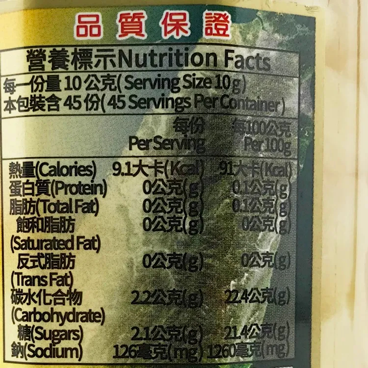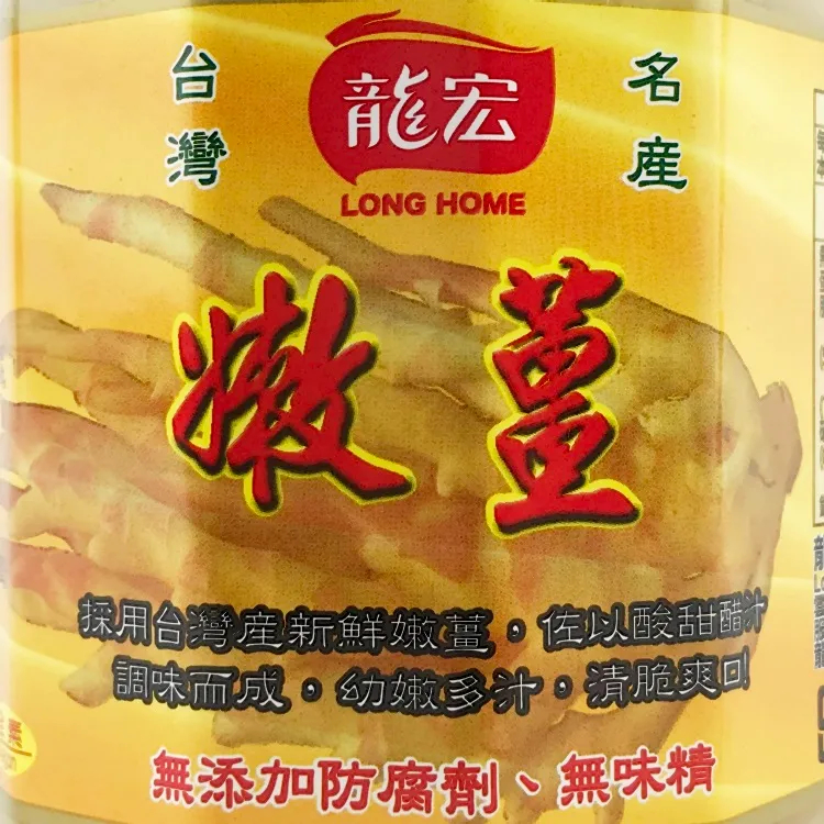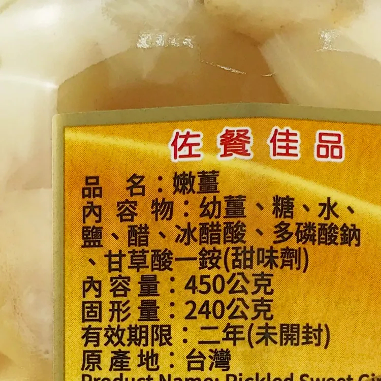 【成分】幼薑、糖、水、鹽、醋、冰醋酸、多磷酸鈉甘草酸一銨(甜味劑)