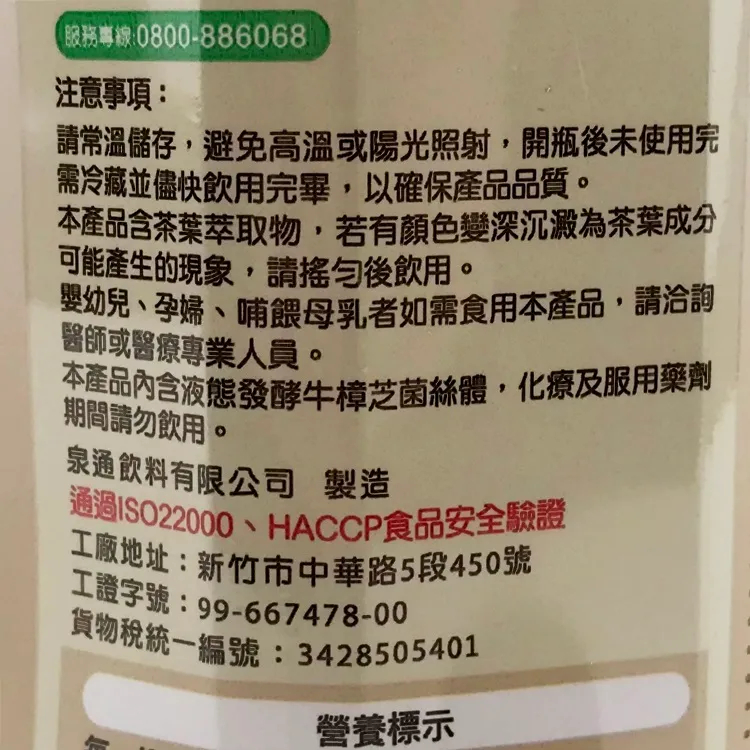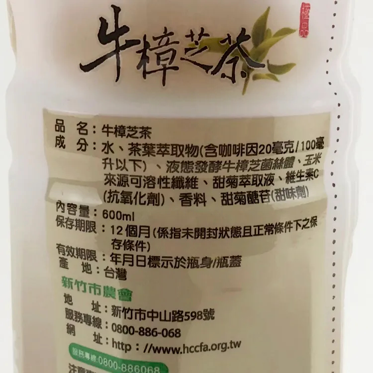 成分:水、茶葉萃取物(含啡因20mg/100ml以下)、液態發酵牛樟芝菌絲體、玉米來源可溶性纖維、甜菊萃取液、維生素C(抗氧化劑)、香料、甜菊劑(甜味劑)