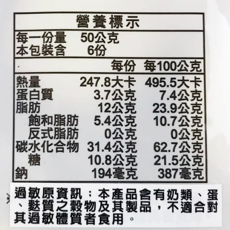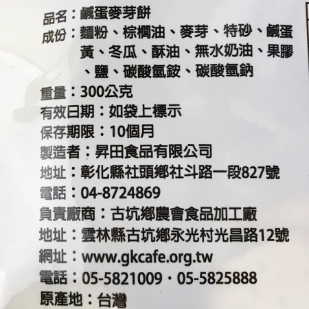 【成份】:麵粉、棕櫚油、麥芽、特、鹹蛋黃、冬瓜、酥油、無水奶油、果膠、鹽、碳酸氫銨、碳酸氫鈉