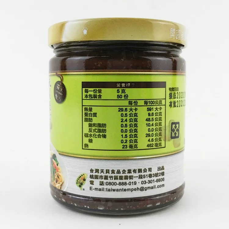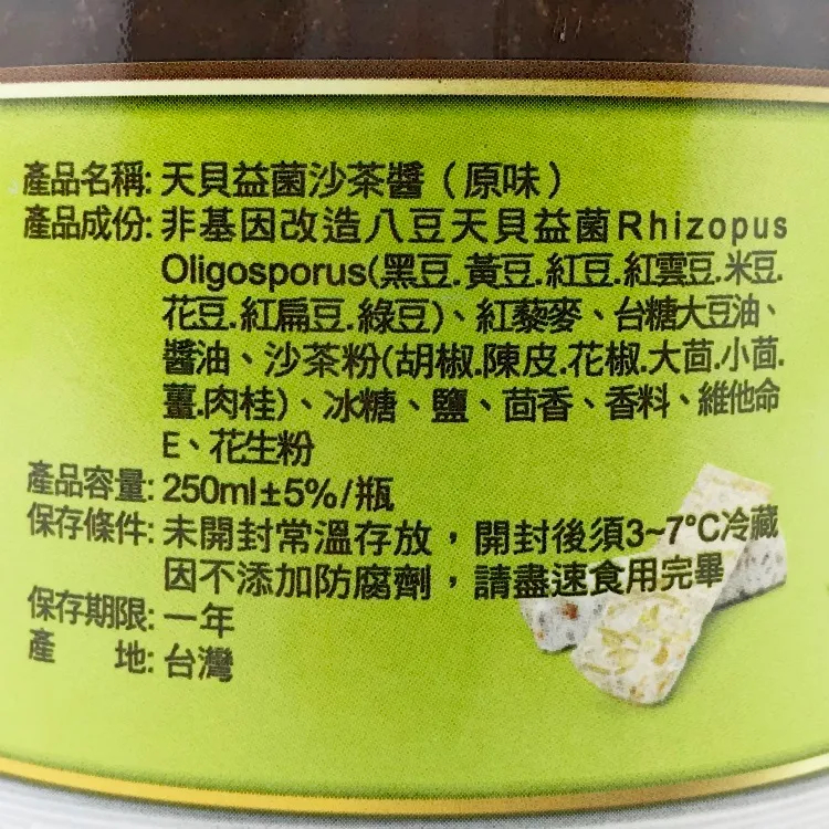 【成分】非基因改造八豆天貝益菌Rhizopus Oligosporus (黑豆、黃豆、紅豆、紅雲豆、米豆、花豆、紅扁豆、綠豆)、紅藜麥、台糖大豆油、醬油、沙茶粉(胡椒、陳皮、花椒、大茴、薑、肉桂)、冰糖、鹽、茴香、香料、維他命E、花生粉