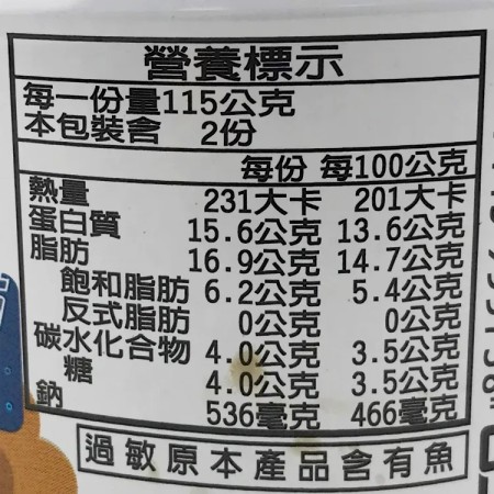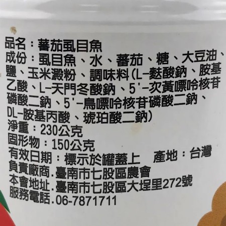【成份】:虱目魚、水、蕃茄、糖、大豆油、鹽、玉米粉、味味料(L-麩酸鈉、胺基乙酸、L-天門冬酸鈉、5'次黃嘌呤核苷磷酸二鈉、5'-鳥嘌呤核苷磷酸二鈉、DL-胺基丙酸、琥珀酸二鈉)