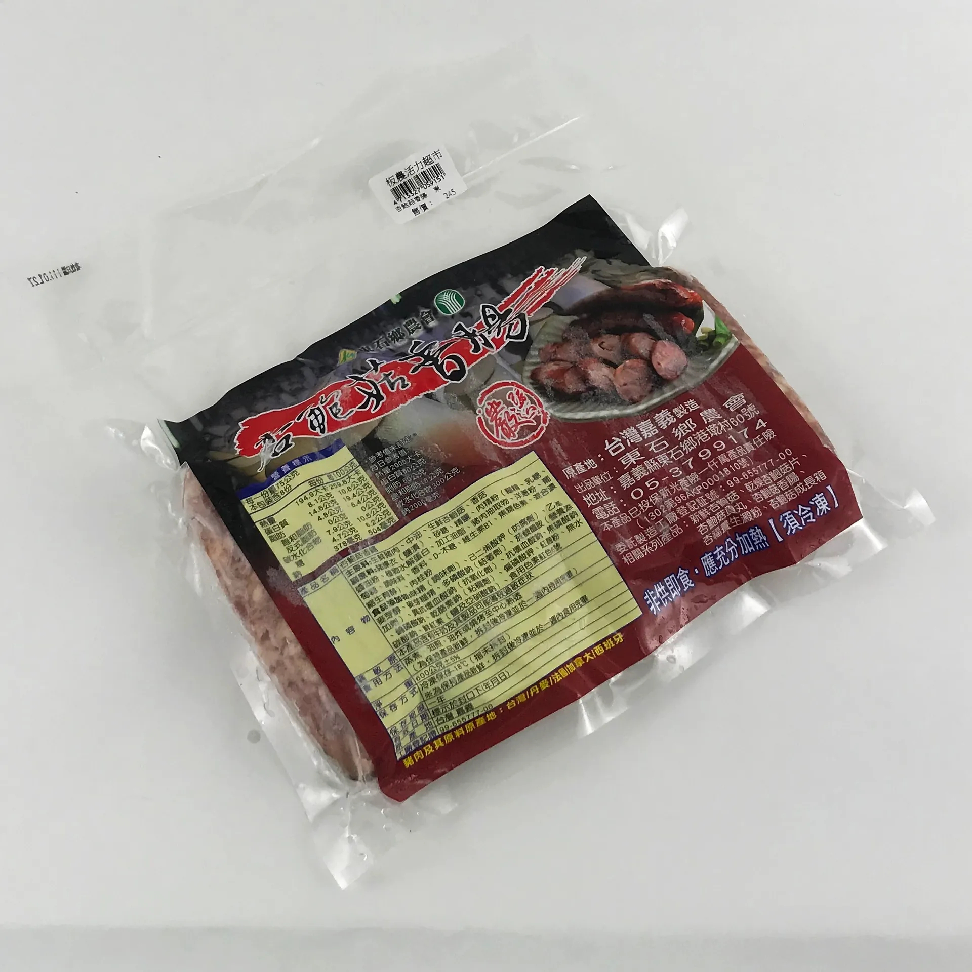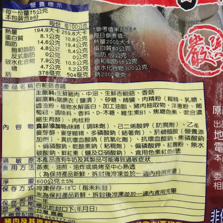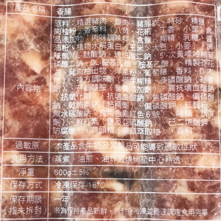 【成分】主原料[生鮮豬肉、中油、生鮮杏鮑菇、香菇]、副原料[豬腸衣(鹽漬)、砂、精鹽、肉粉粉(糊精、乳糖、醬油粉、植物水解蛋白、加工油脂、豬肉抽取物、洋蔥粉、葡萄糖、調味料、香料、D-木糖、維生素B1、焦糖色素、混合縮生育醇)、肉桂粉]、食品添加物[味精(調味劑)、己二烯酸鉀(防腐劑)、乙基麥芽醇、麥牙糊精、多磷酸鈉(結著劑)、菸鹼醯胺(營養添加劑)、異抗壞血酸鈉(抗氧化劑) 、抗壞血酸鈉、焦磷酸鈉、偏磷酸鈉、乾酪素鈉(粘稠劑)、偏磷酸鉀、紅麹粉、無水碳酸鈉、鮮紅素(鹽及亞硝酸鈉)、食用紅色素色6號]